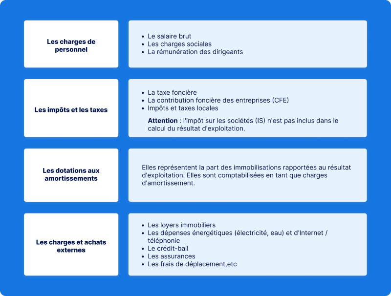 Avec l'excédent brut d'exploitation, il est possible de calculer le résultat d'exploitation en ajoutant des reprises sur charges d'exploitation, des transferts de charges d'exploitation, etc. L'EBE inclut une soustraction des dotations aux amortissements, aux provisions ainsi que le retrait des charges de gestion.